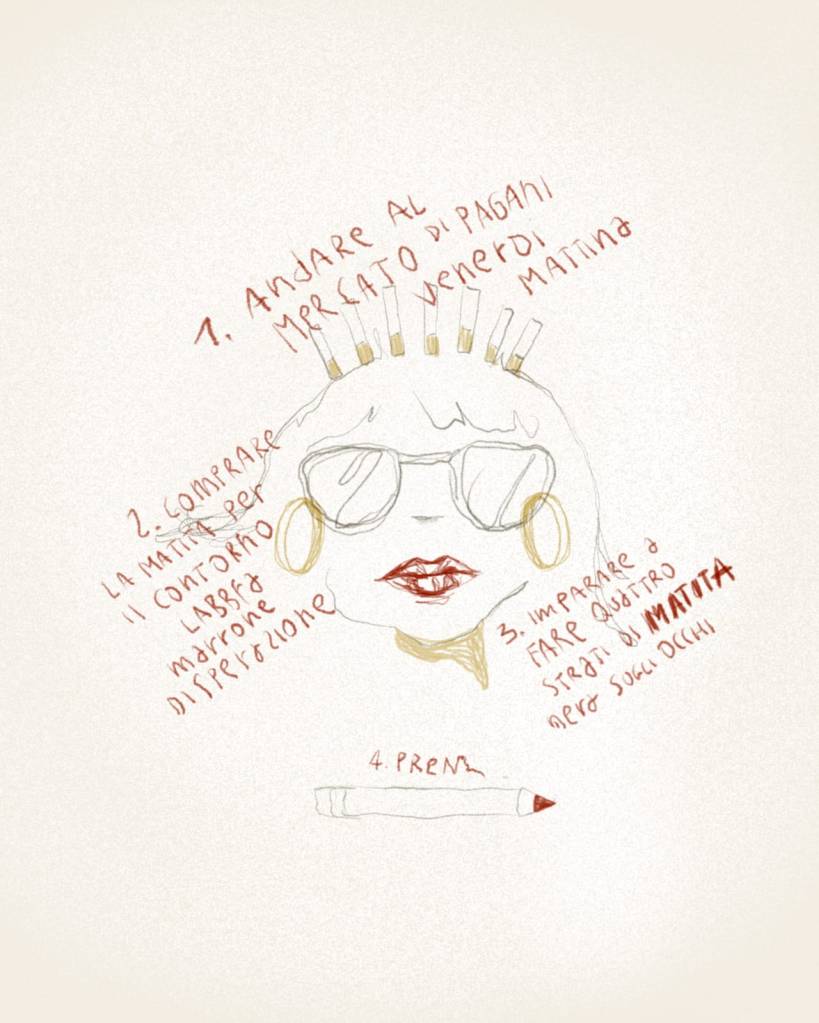 Mi dice che devo essere esagerata nello scompormi, che mi devo vestire come Concetta Mobili, che è proprio tale e quale alla madonna dell’Arco, però è profana. Però io non li tengo i vestiti di Concetta Mobili, manco una cosa leopardata. Quindi ho pianificato il da farsi.